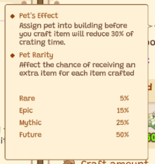 * Assigning pets to craft items will reduce 30% crafting time. (applied to all pet rarities & mood states)