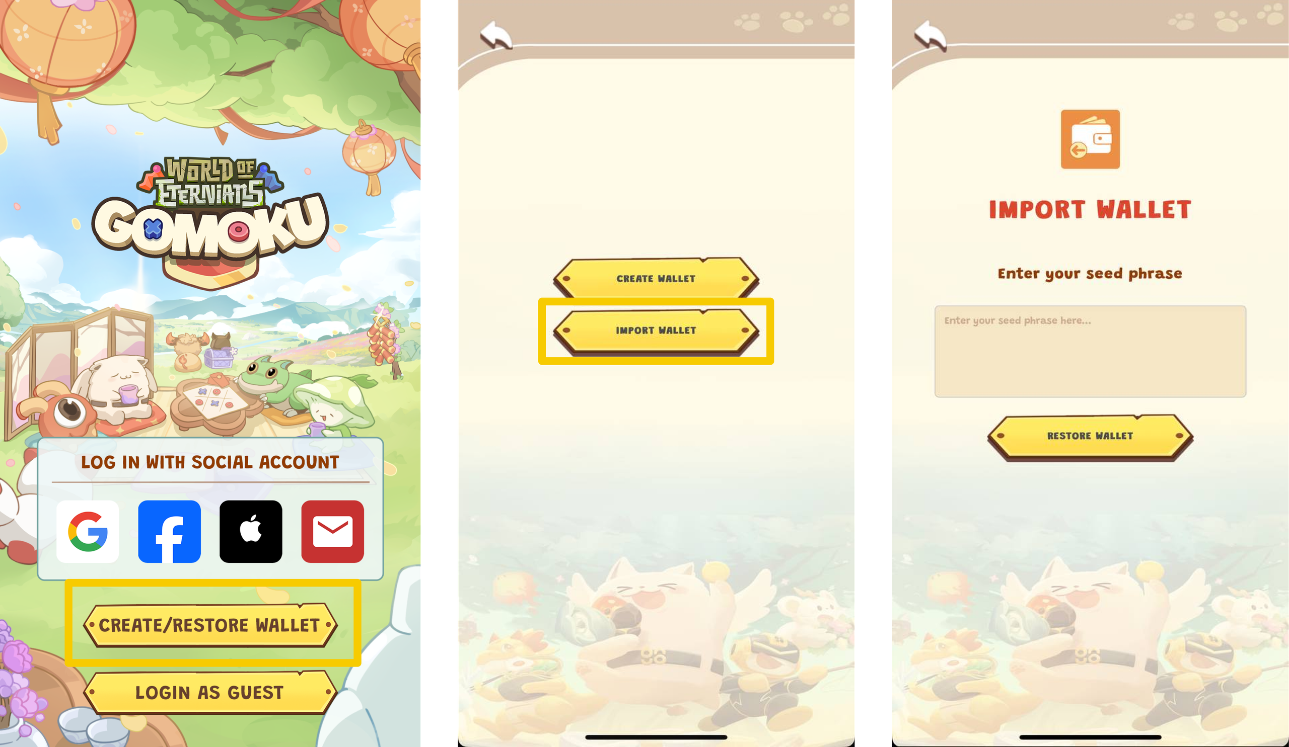 1. On the Welcome screen of the game, click on **Create/Restore Wallet** → Select **Restore Wallet**.