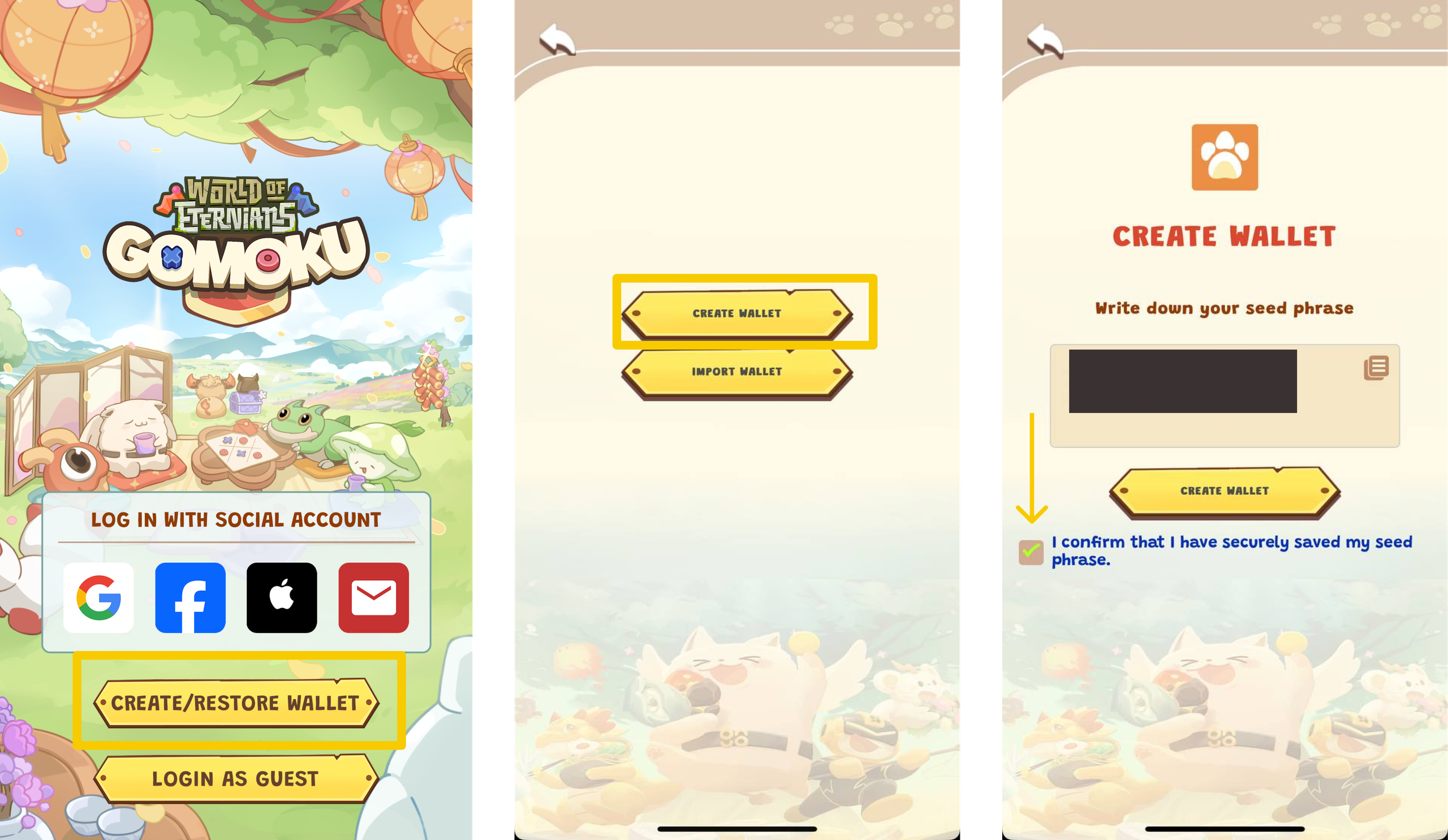 1. On the Welcome screen of the game, click on **Create/Restore Wallet** → Select **Create Wallet**.